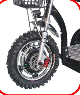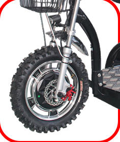 KNOBBY TIRE – OFF-ROAD SCOOTERLeader XL-700 with super 16” knobby off-road tire INCREDIBLE TRACTION, 20mph - 20 mile range - head lights, tail lights, brake lights, disc brakes on all wheels, front basket, rear view mirror, high-back bucket seat, 700W 3-speed hub mounted motor, forward/reverse 48V/10Ah Lithium battery. Heavy duty 110v charger included.